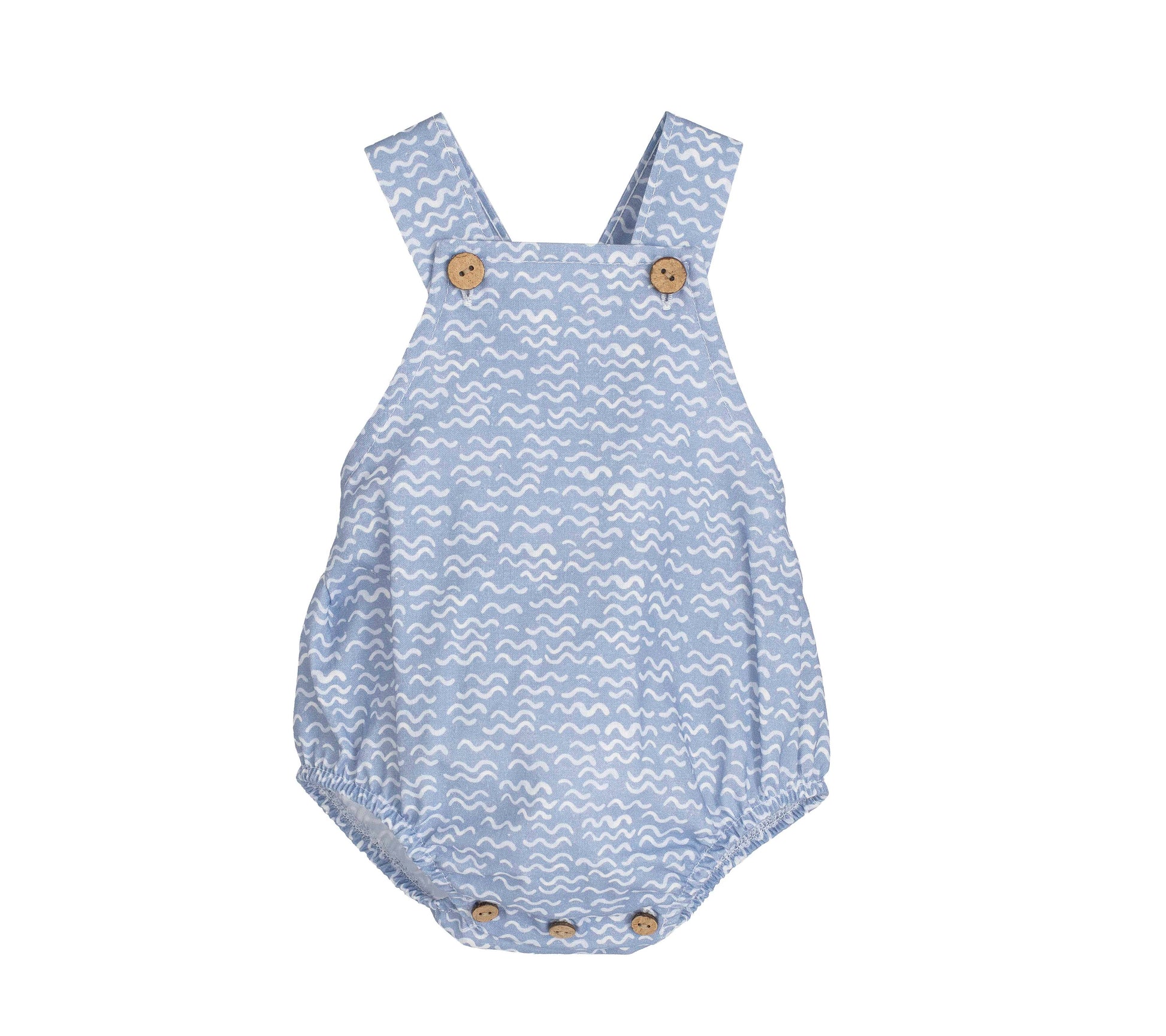 Peto para bebé de la familia Sikar de Calamaro, una prenda cómoda y fresca, ideal para los meses de verano. Su diseño en color azul con estampado de ondas aporta un estilo dulce y veraniego, perfecto para el día a día o para ocasiones especiales.