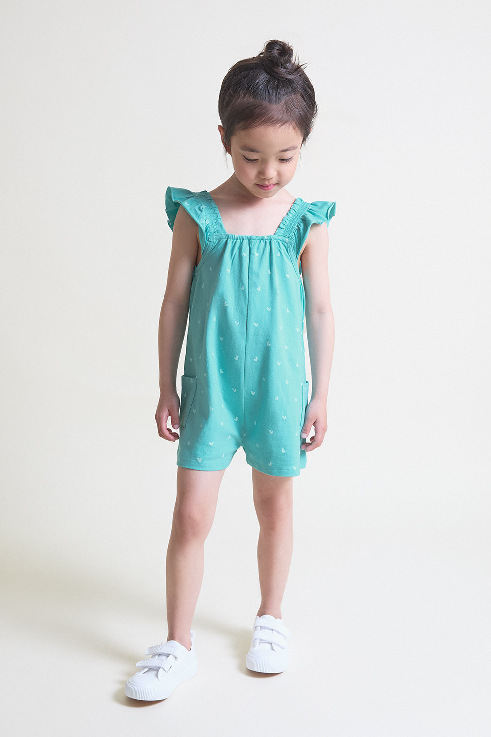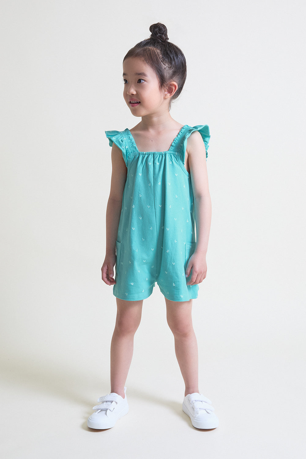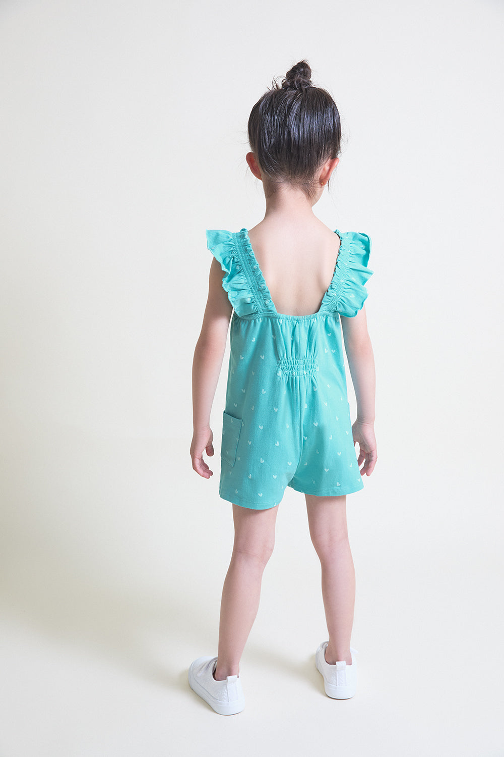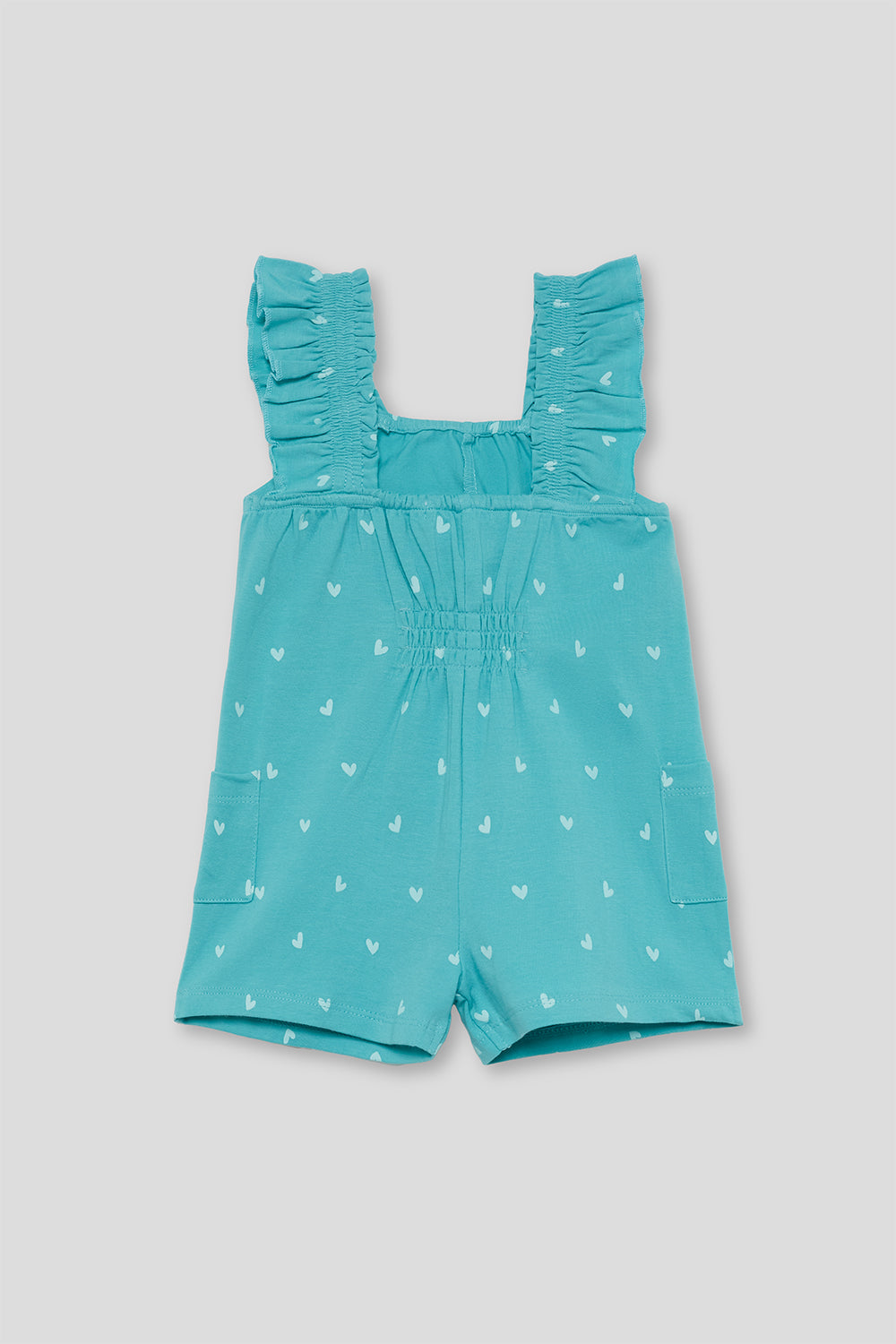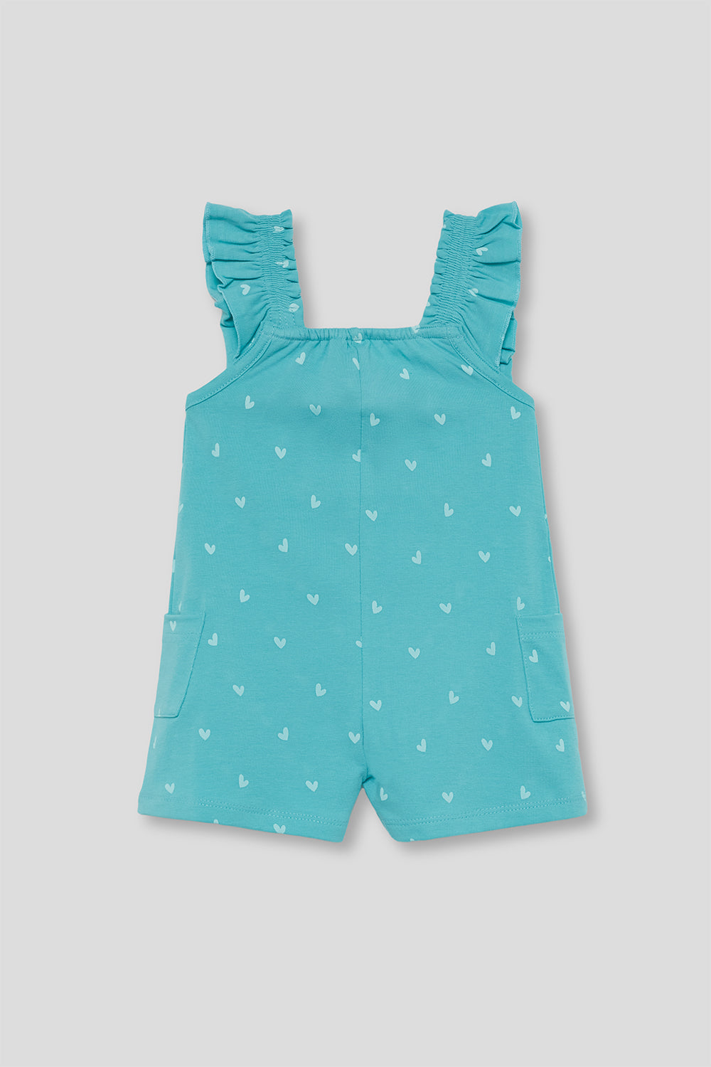 Peto infantil para bebé niña confeccionado en algodón suave y ligero, perfecto para garantizar comodidad y libertad de movimiento durante los días de verano. Su diseño en color turquesa con delicado estampado de pequeños corazones aporta un estilo dulce y actual.