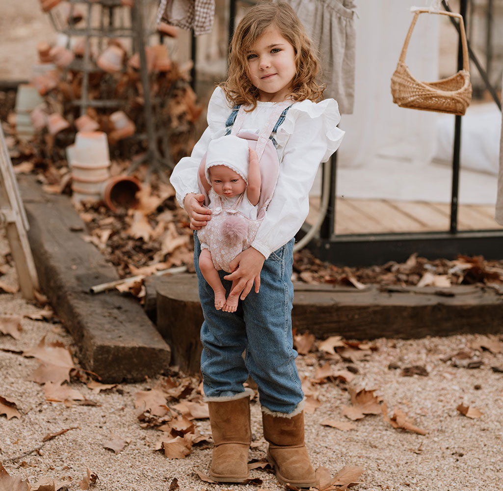Portabebé rosa con florecitas blancas y pompón – Para muñecos de 40-45 cm 🧸✨