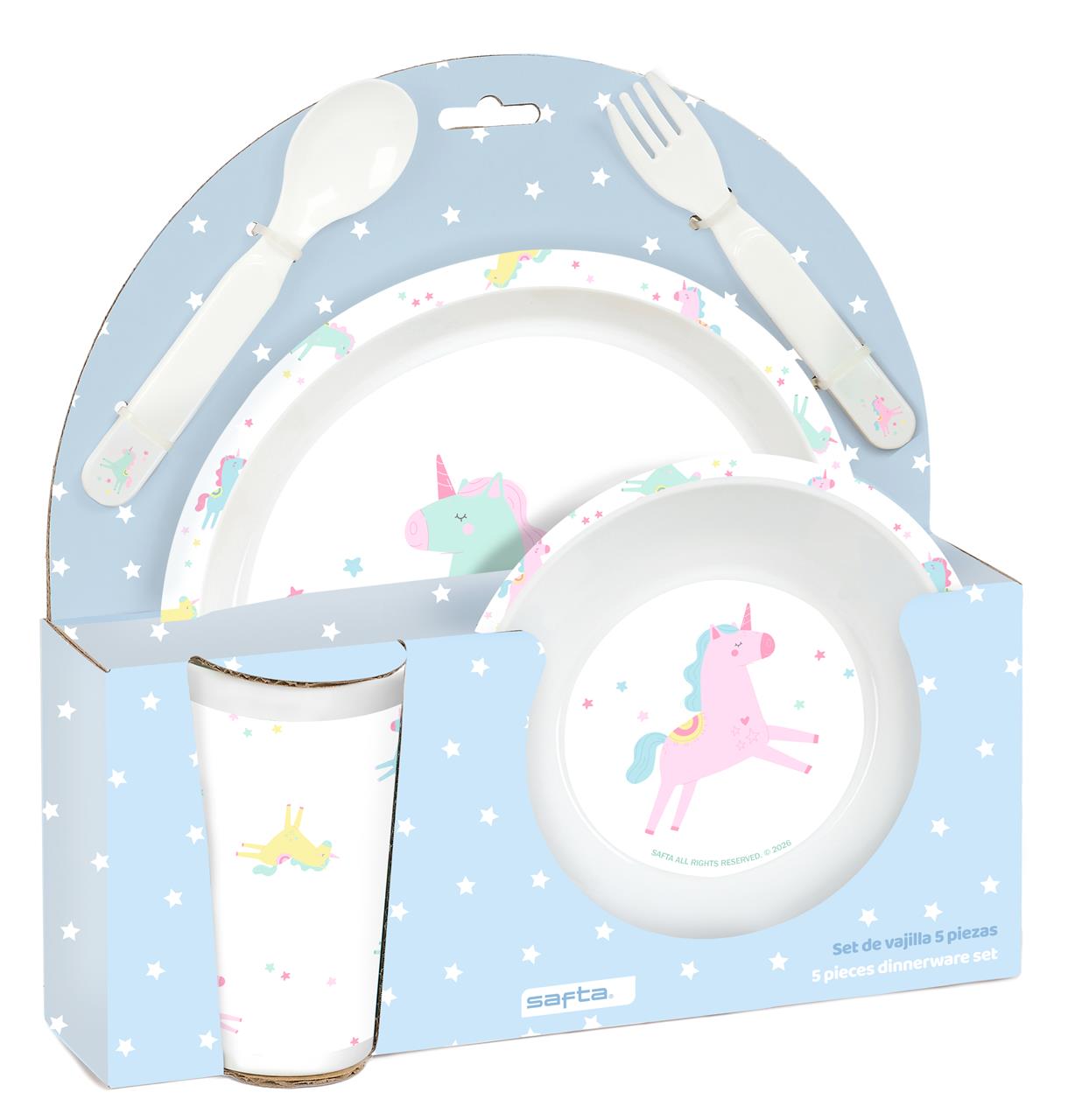 Set vajilla infantil 5 piezas Safta Unicornio azul – Plato, bol, vaso y cubiertos