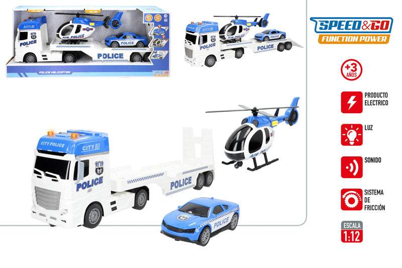 Camión Portavehículos Policía 1:12 con Luz y Sonido (Fricción)-Speed&Go